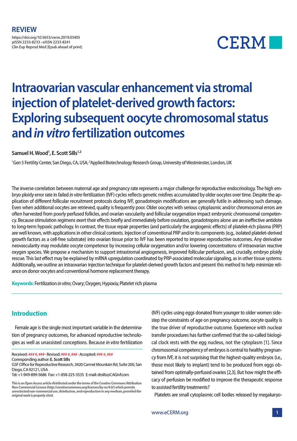 Wood, S. H., & Sills, E. S. (2020). Intraovarian vascular enhancement via stromal injection of platelet-derived growth factors: Exploring subsequent oocyte chromosomal status and in vitro fertilization outcomes. Clinical and experimental reproductive medicine, 10.5653/cerm.2019.03405. Advance online publication. https://doi.org/10.5653/cerm.2019.03405